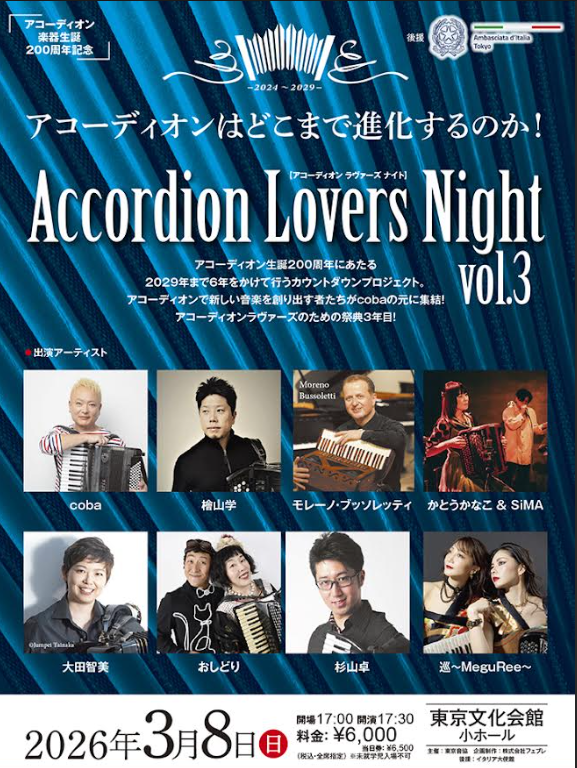 | 〈プレイガイド〉 | プレイガイド:東京音協オンライン https://t-onkyo.co.jp/ チケットぴあ https://w.pia.jp/t/aln-vol3/ セブンイレブン (直接購入可能)【Pコード:316-542】 ローソンチケット https://l-tike.com/accordionloversnight/ ローソン、ミニストップ店内端末「Loppi」(直接購入可能)【Lコード:76033】 イープラス https://eplus.jp/accordionloversnight/ ファミリーマート店内端末「マルチコピー機」(直接購入可能) 東京文化会館チケットサービス TEL:03-5685-0650 (10:00~18:00※休館日有り) ※会館窓口:10:00~19:00(休館日を除く) 【プレイガイド先行販売:2025年 12月 26日(金) 11:00~】【一般発売:2026年 1月 17日(土)10:00~】 |